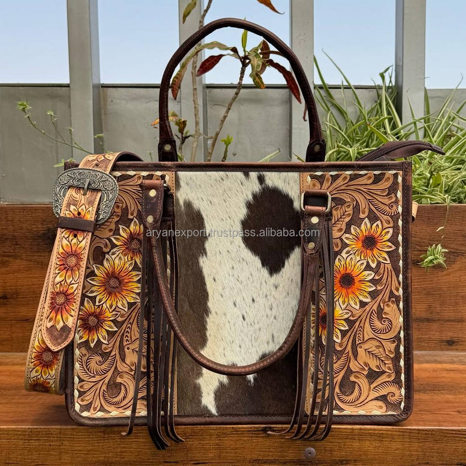 Product Name:Hand Tooled Sunflower Cowhide Fringe Tote Bag