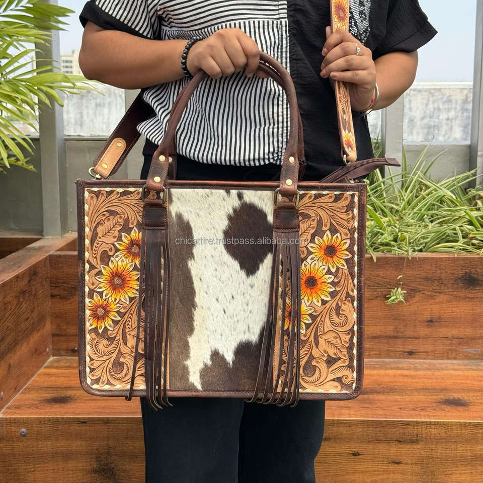 Product name:Hand Tooled Sunflower Cowhide Fringe Tote Bag