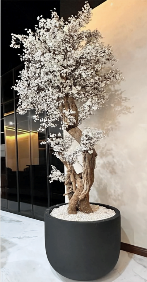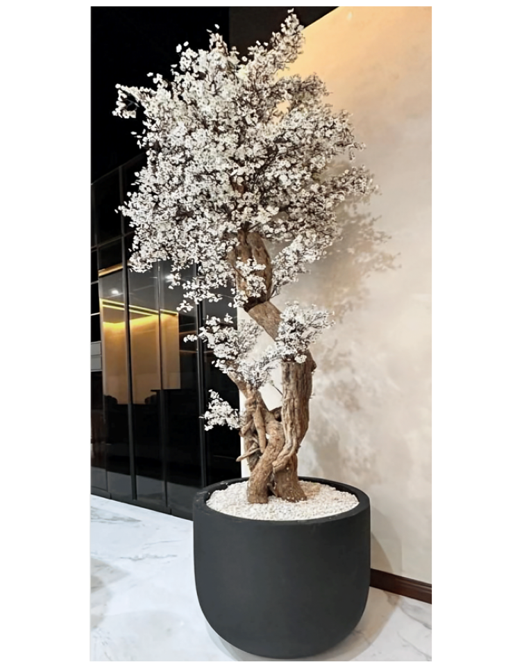 Nexa black GRP planter with Aritificial white BLOSSOM Tree