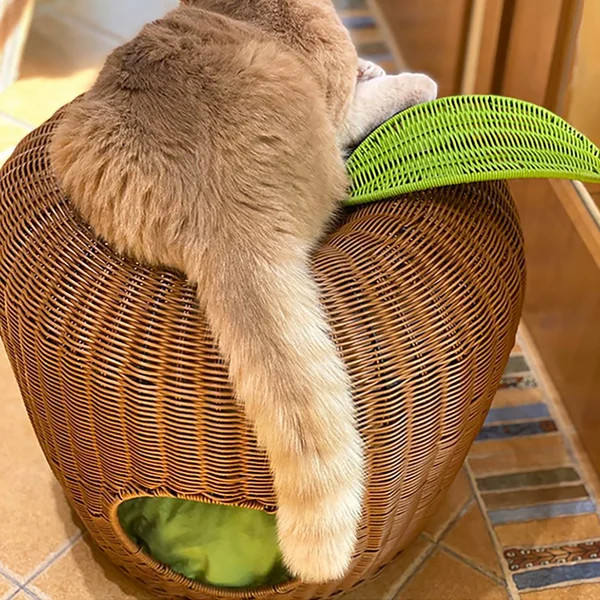 New Eco-friendly Rattan Cat Bed Woven Apple-shape Dome Cat Cave in Brown Elevated Cushion Sofa Natural Pet Houses & Furniture