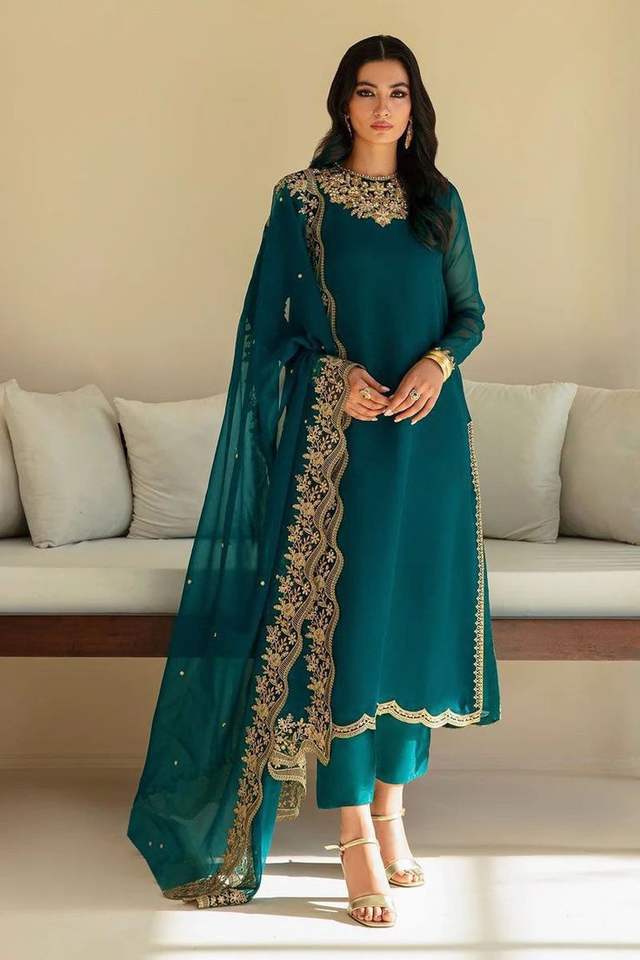 New-Elegant-Designer Indian/Pakistani Long Kurta, Pant & Dupatta Party-Wear/Wedding Dress with Hand Zari Embroidery work @ 2025