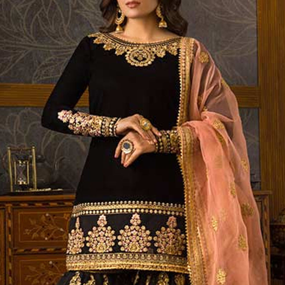 New Embroidered Black Dress Net Dupatta with 4 Side Patti and Raw Silk Trouser Pakistani and Indian Party Wear