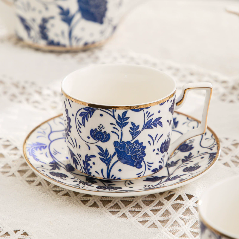 New European Style Blue Flower Patterned Ceramic Cups and Plates for Restaurants and Afternoon Tea