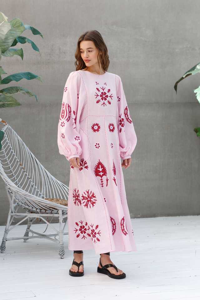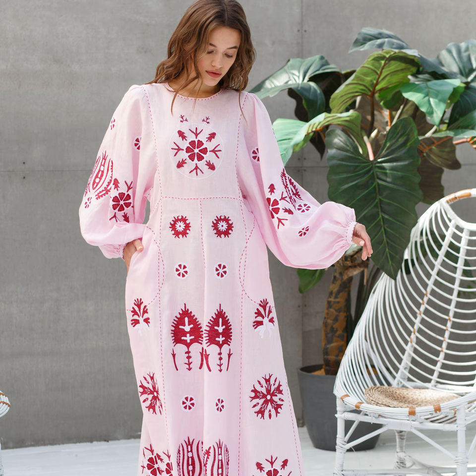New Exclusive Floral Embroidered Ukrainian Long Balloon Sleeves Ethnic Ukraine Dresses Stylish White Bohemian Ukrainian Long