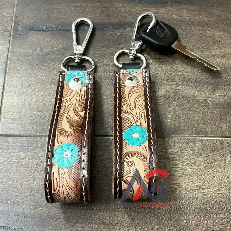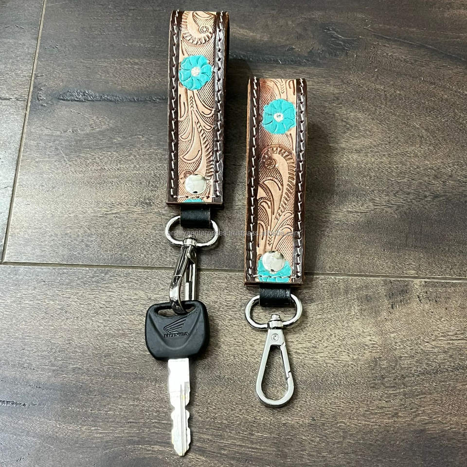 New Factory Direct Wholesale Floral Tooled Cow Leather Premium Handmade Keyrings Unisex Stylish Wristlet Souvenir Bag Charms