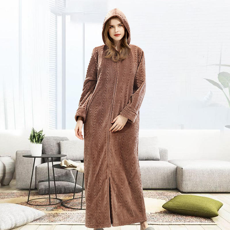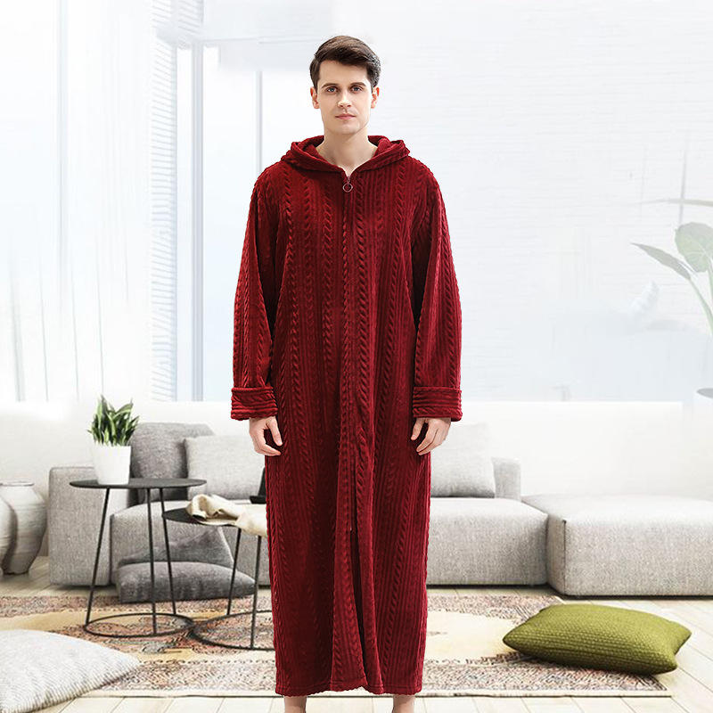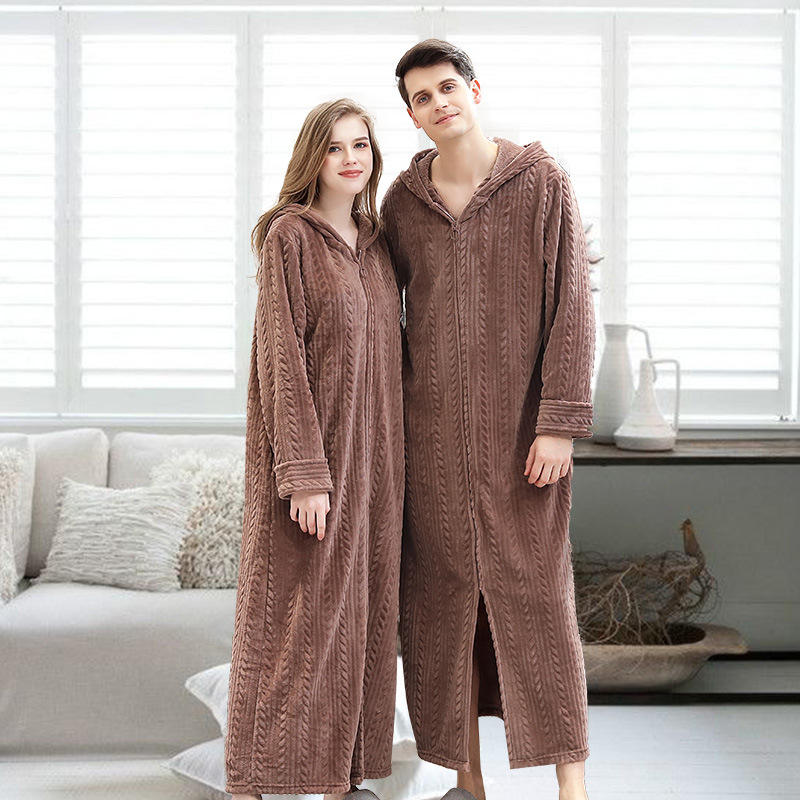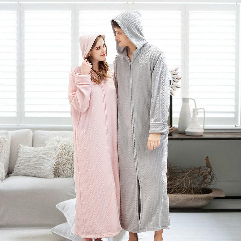 New Fall and Winter Zip-up Bathrobe with Hooded Lengthen the Sleeves Dressing Gown Couple's Flannel Nightgown