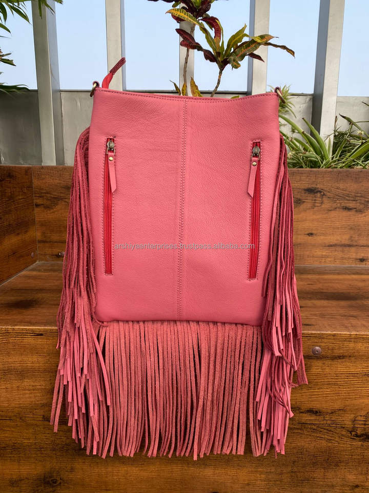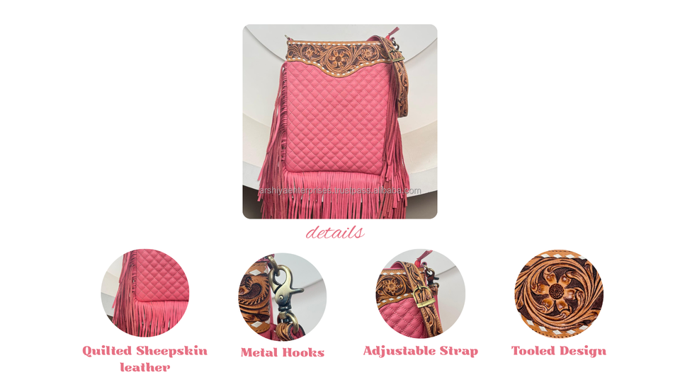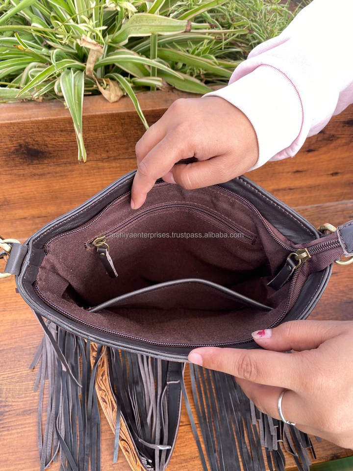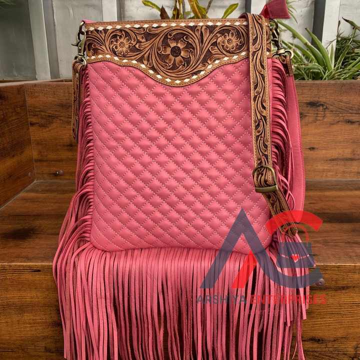 Product name:Hand Tooled Diamond Lattice Crossbody Fringe Bag