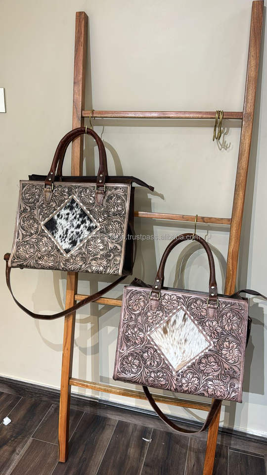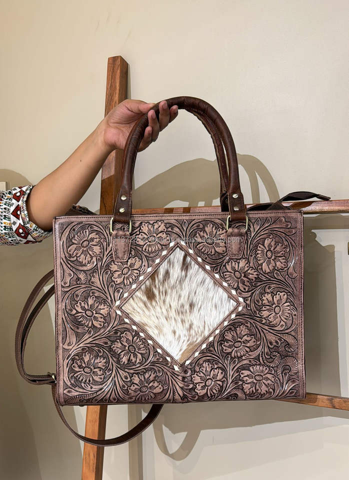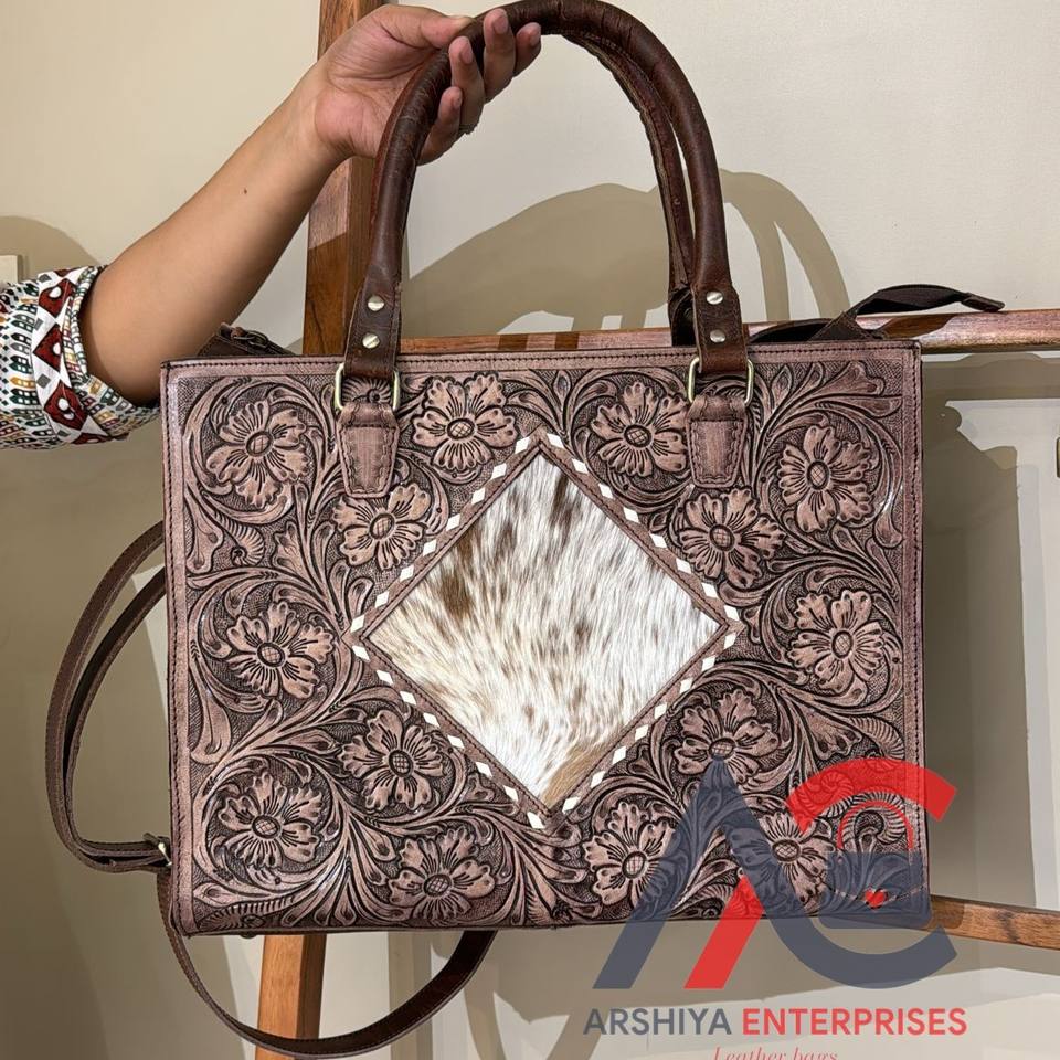 New Fashion Genuine Hair on Tooled Leather Bohemian Buck Stitch Tote Bags Western Hand Carving Leather Cowhide Purse for Women's