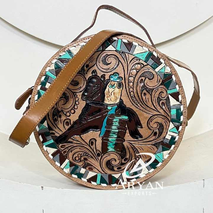 Women's Hand Tooled Leather Shoulder Round Bag