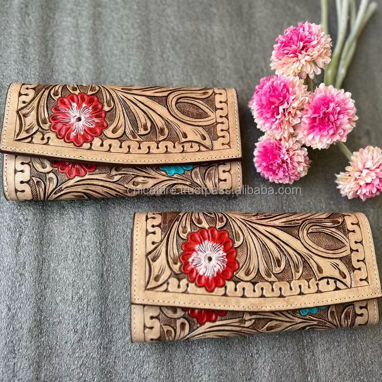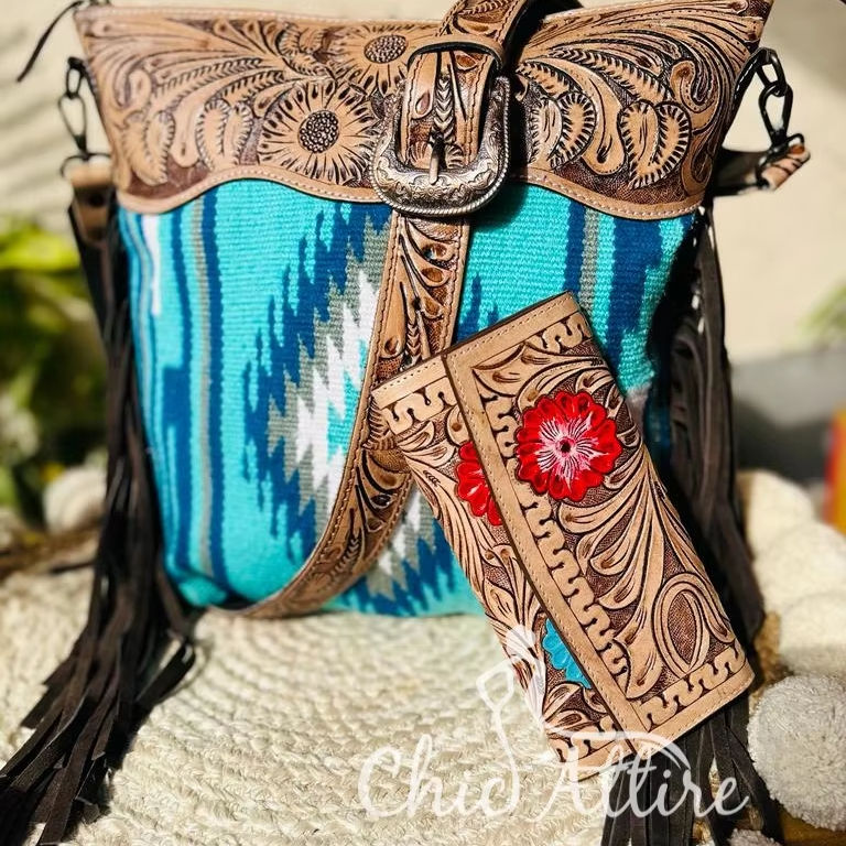 New Fashion Hand Tooled Leather Saddle Blanket Tassel Handbag Stylish Hand Carving Leather Floral Wallet Combo Set for Women's