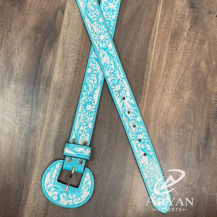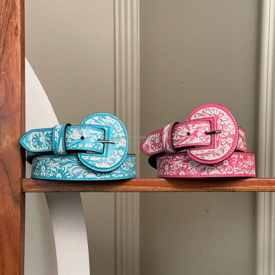 New Fashion Hand Tooled Leather Wide Rounded Buckles Belt for Women Comfortable Durable Turquoise Floral Embossed Western Belts