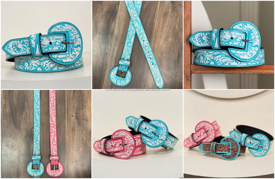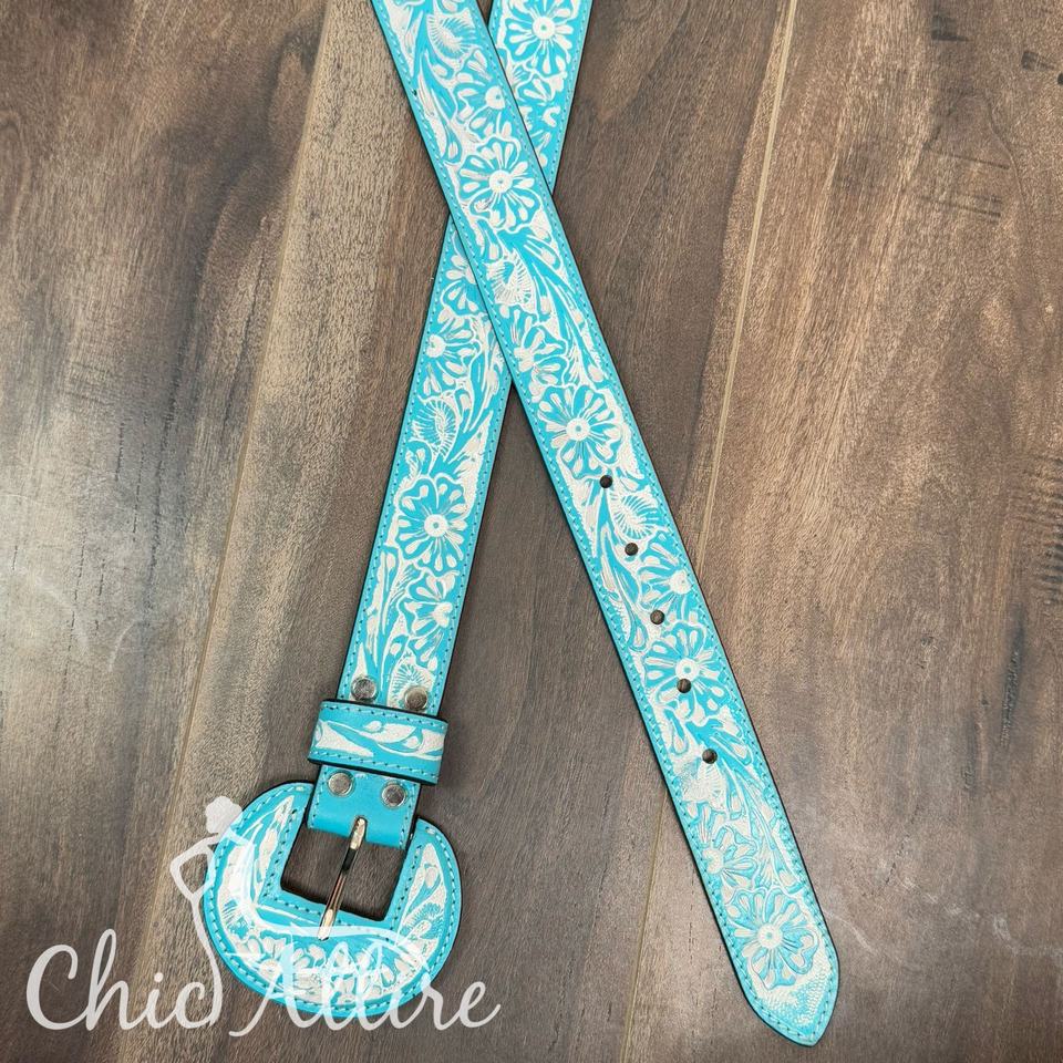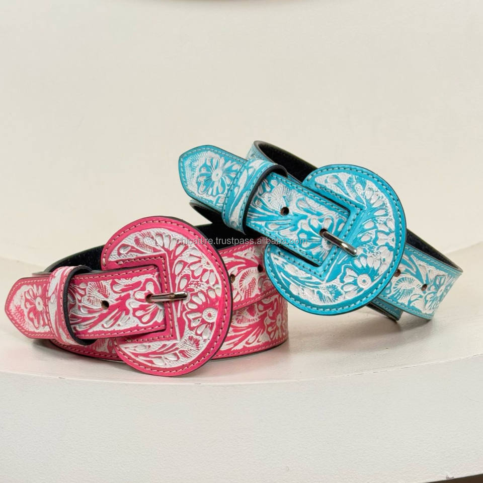 New Fashion Hand Tooled Leather Wide Rounded Buckles Belt for Women Comfortable Durable Turquoise Floral Embossed Western Belts