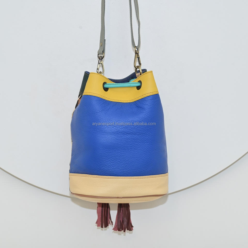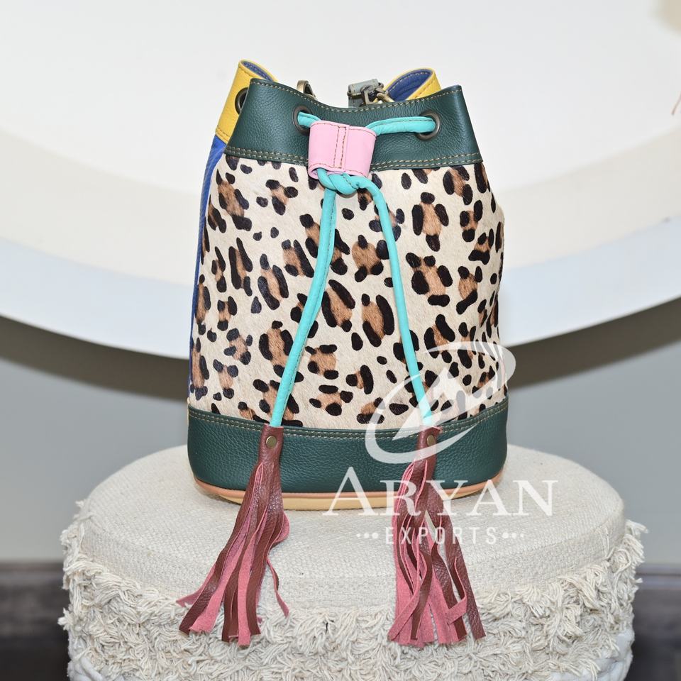 New Fashion Handmade Hair on Animal Print Recycled Leather Crossbody Bucket Bag for Women's Colorful Leather Drawstring Handbag