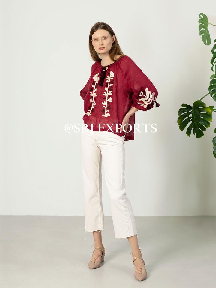 New Fashion High End Customized Burgundy Linen Embroider Shirt Women Tassel Tie Neck Hand Tassel Decor Blouse Casual Top