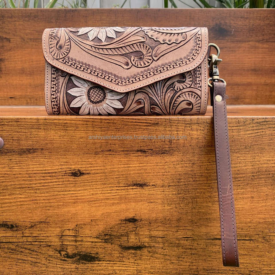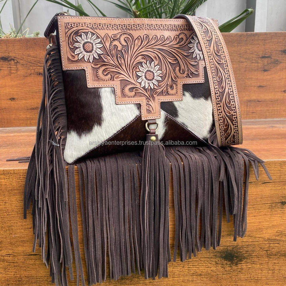 New Fashion High Quality Hand Tooled Genuine Cowhide Leather Fringe Crossbody Bag & Wristlet Clutch 2 Piece Combo Set for Women