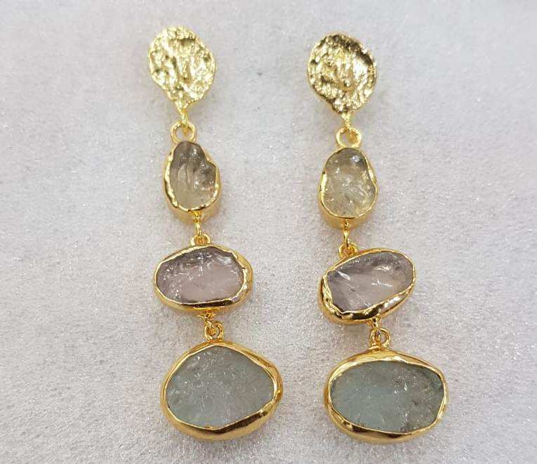 New Fashion Jewelry Earring Citrine Rose Quartz and Aqua Rough Stone Gemstone Jewelry 24k Gold Plated Earring for Girls\women