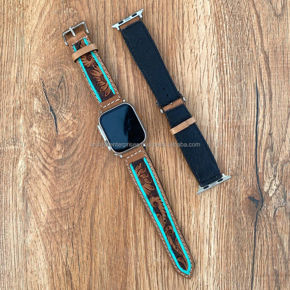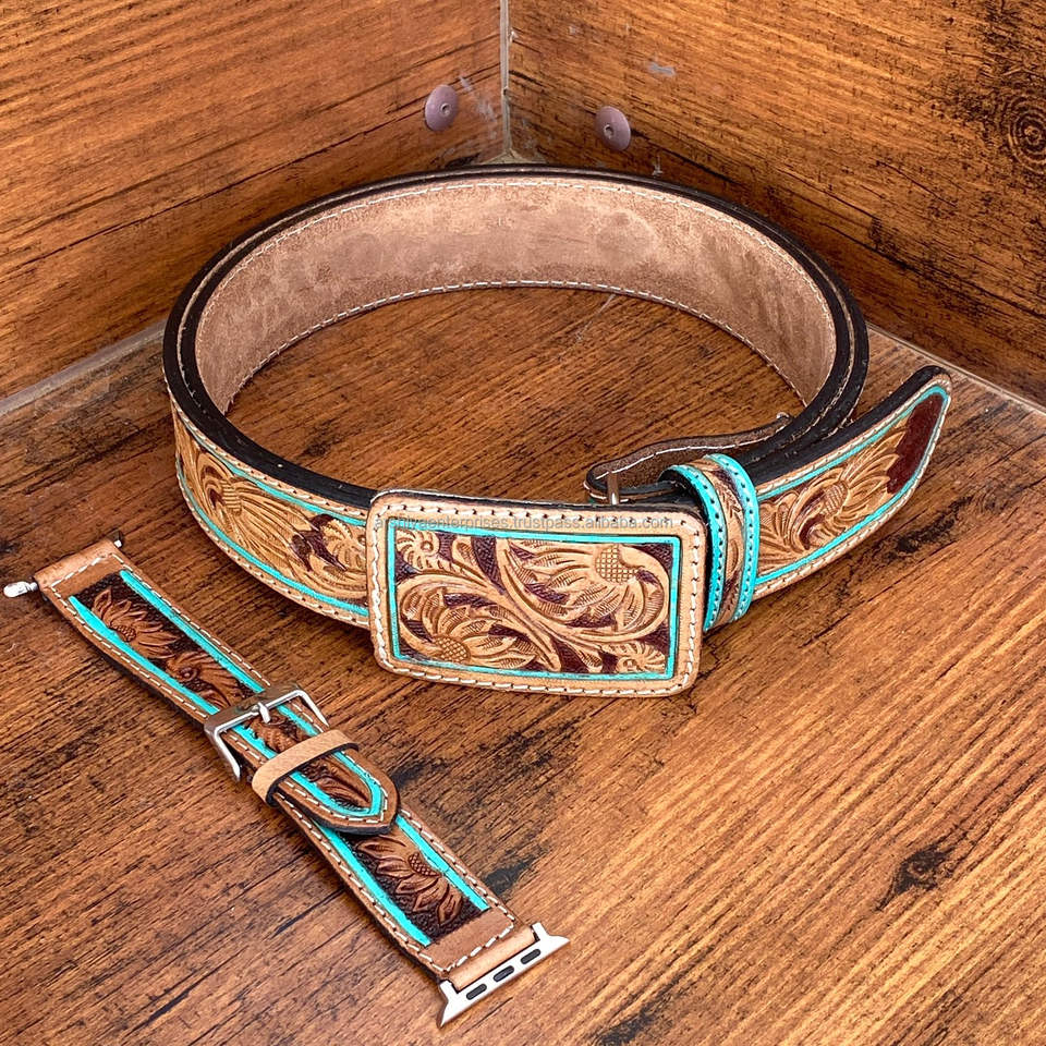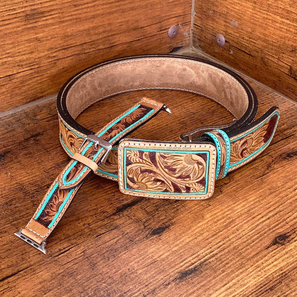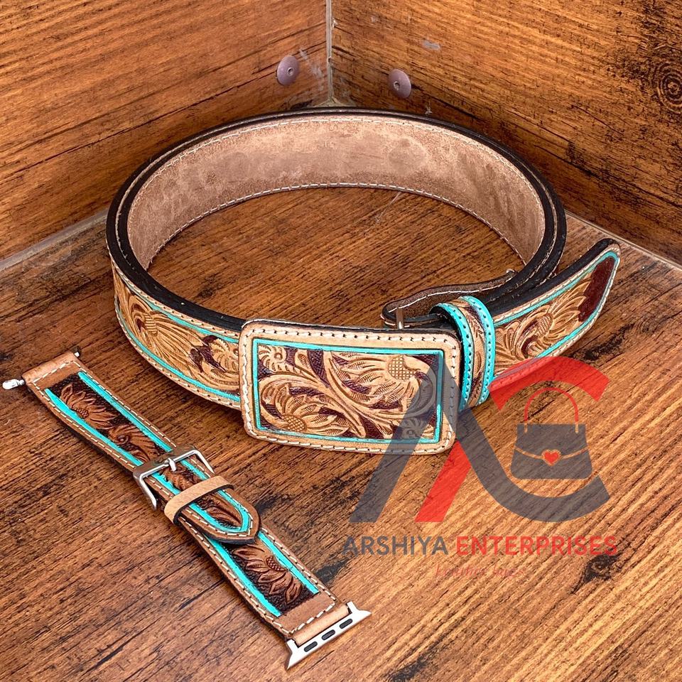 New Fashion Personalized Hand Tooled Leather Western Belt & Hand Tooled Strap Replacement Cow Leather Watch Bands Sets for Women
