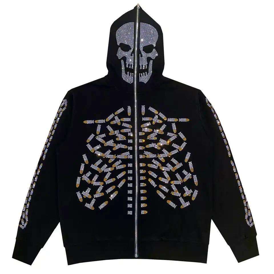 New Fashion Rhinestone Skeleton Full Face Zip Hoodie Street wear Heavy Weight Full Zip up Hoodie for Men Women