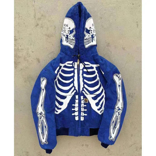New Fashion Streetwear Custom Logo Skull Halloween Hoodie Oversized Skeleton Thick Rhinestone Full Zip up Hoodies Men