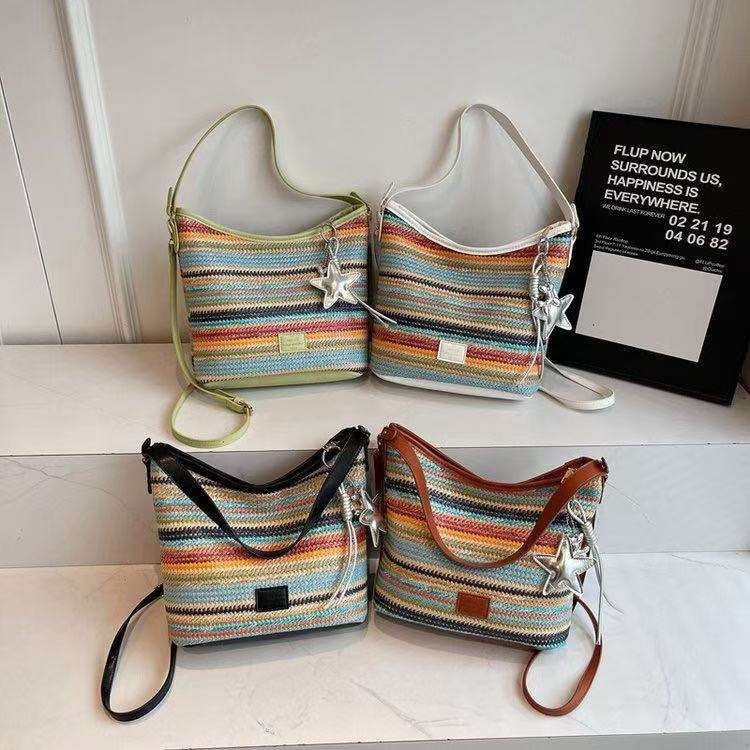 New Fashion Vintage Straw Women's Shoulder Bag with Colored Belt Lining Summer Single Strap for Travel & Daily Use