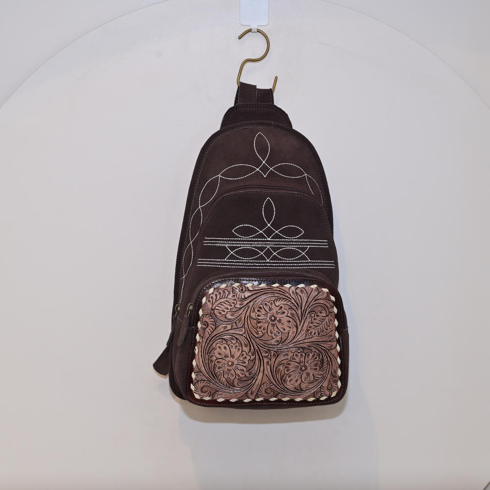 Women's New Fashion Vintage Brown Suede Leather Backpack Sling Bag Boot Stitch Chest Bag Floral Crossbody Design Western-Style