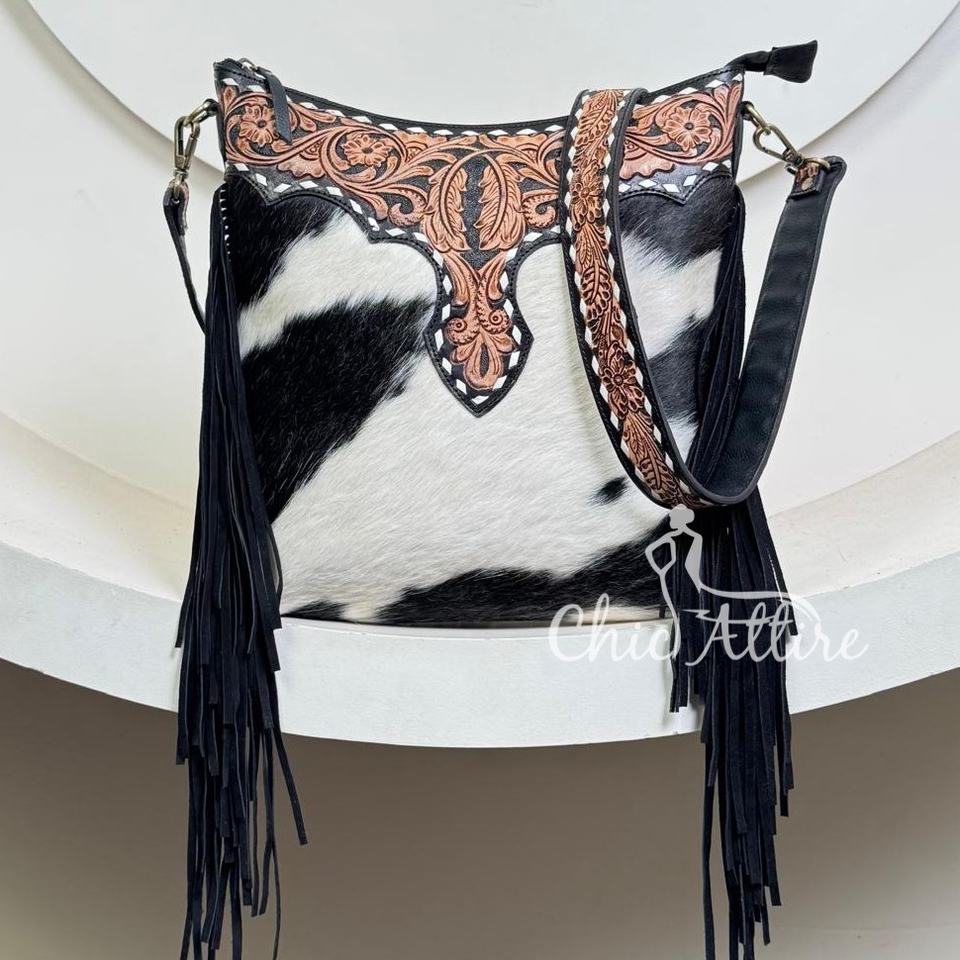 Product name:Hand Tooled Cowhide Leather Fringe Crossbody Bag