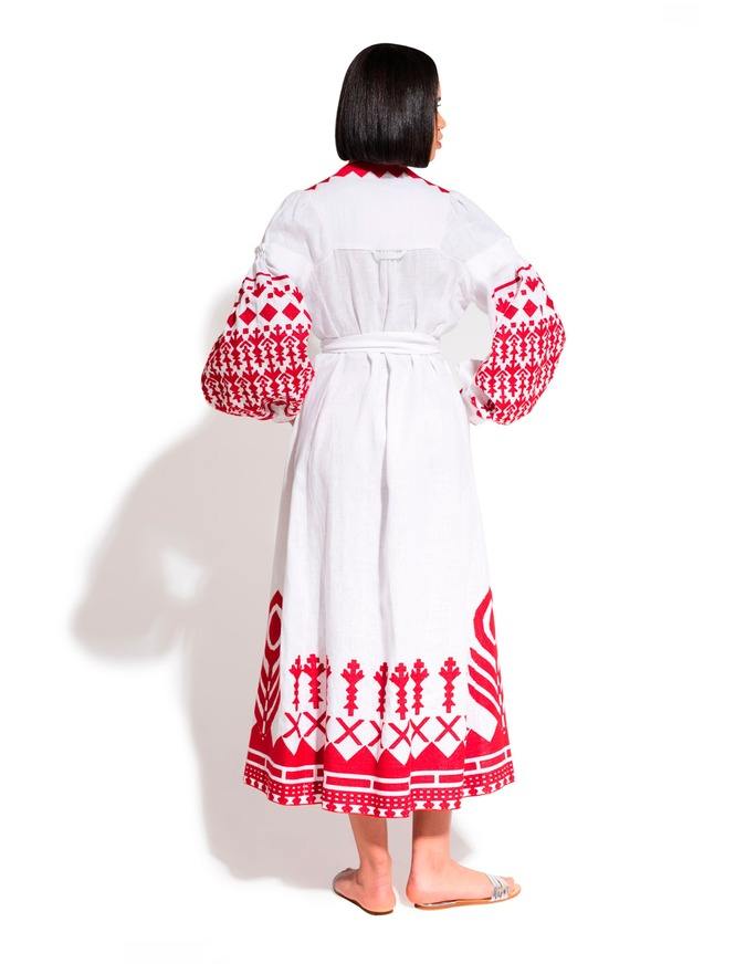 New Fashion Wholesale Vintage Look White Ukrainian Dress with Red Embroidery with Tassel Full Sleeve Long Maxi Dress