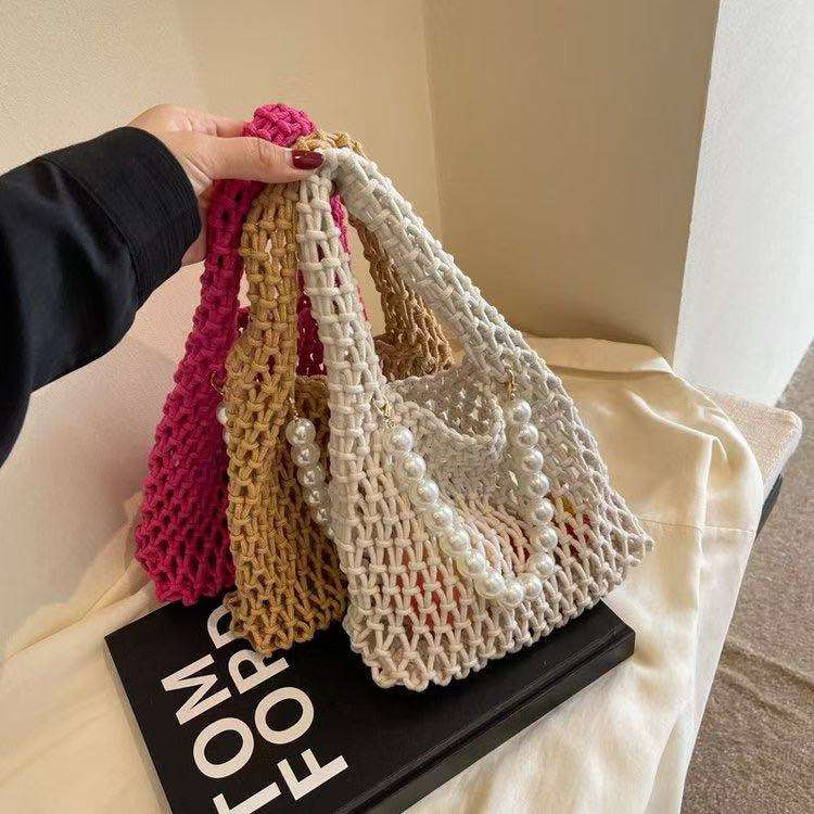 New Fashion Woven Pearl Straw Women's Handbag with Hollow Design Vintage ZIP Closure Summer Single for Daily Life & Travel