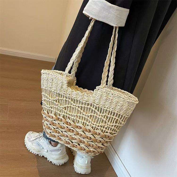 New Fashionable Lady Casual Woven Hollow Straw Vintage Single Zip Winter Bucket Shoulder Bag for Summer Travel
