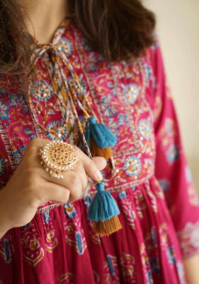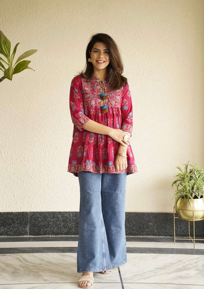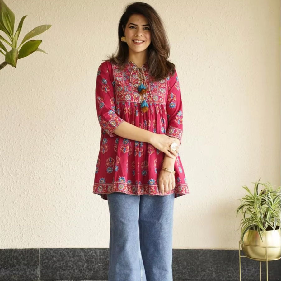 New Fashionable Pink Floral Printed Pure Cotton Sequined Kurti Top for Womens