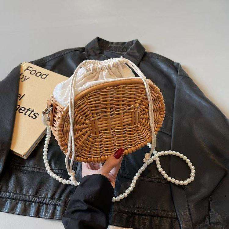 New Fashionable Woven Women's Bag with Pearl Shoulder Strap Spring ZIP Closure Niche Handbag for Travel & Outdoor Shopping