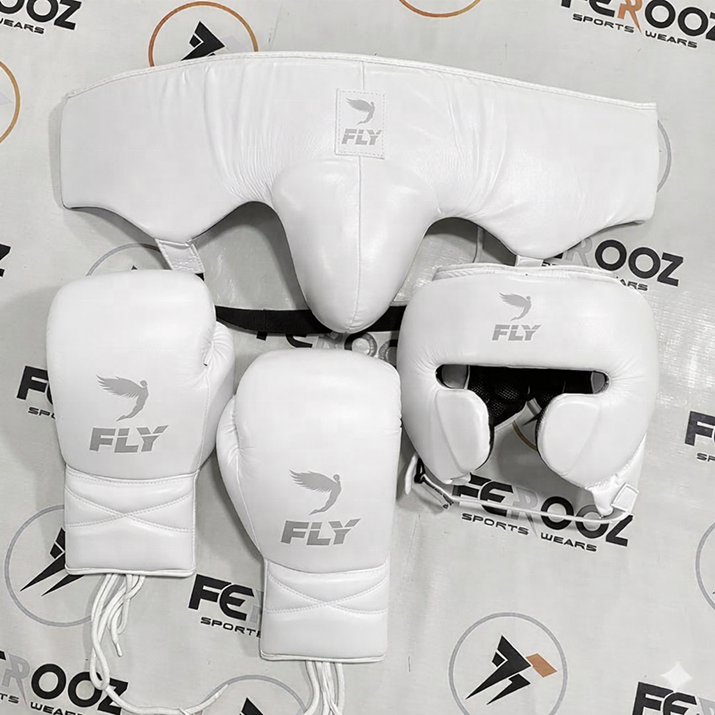 New Fly Customized White Boxing Sparring Set High Quality Protection Gear Boxing Gloves Headgear Groin Guard Training Hand Grips
