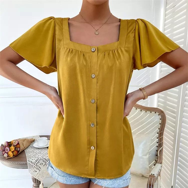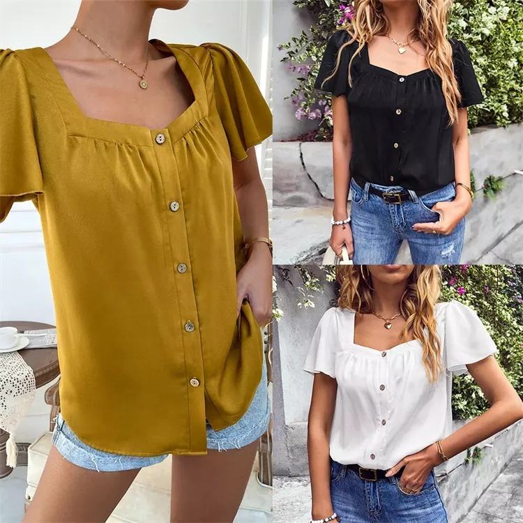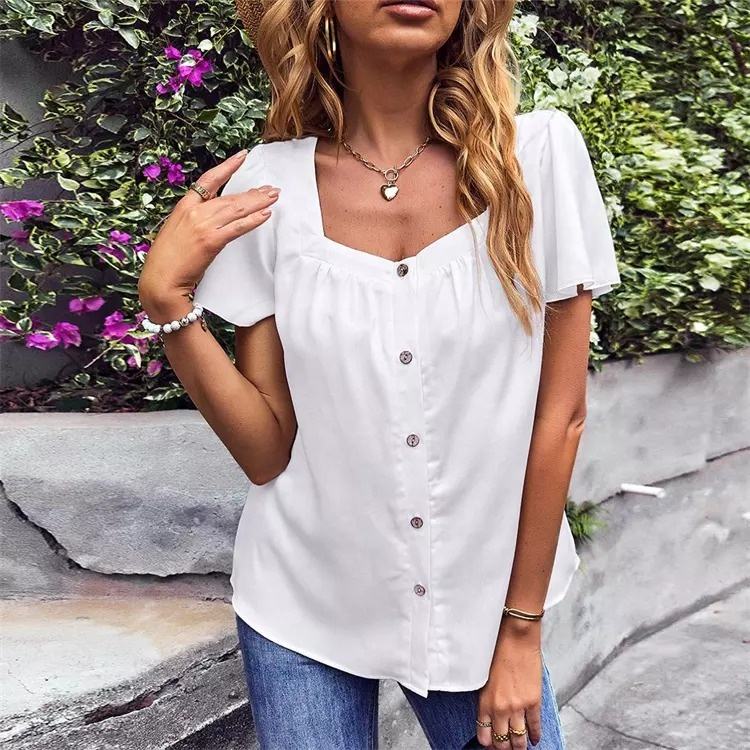 New French Style Square Neck Solid Color Ladies Top Button Design Elegant T-shirt Women's Shirt Blouse