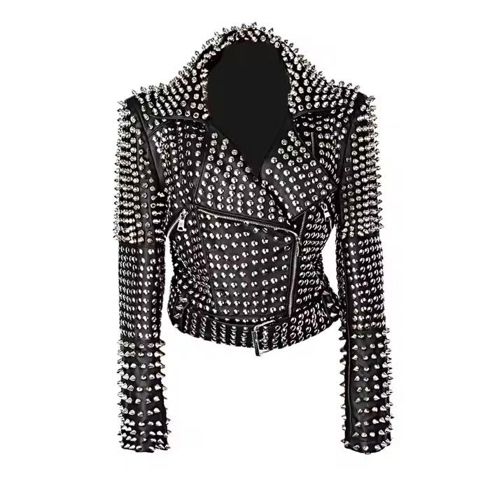 New Genuine Women's Metal Spikes Brand New Motorcycle Slim Fit Genuine Leather Coat Biker Black Studded Leather Punk Jacket