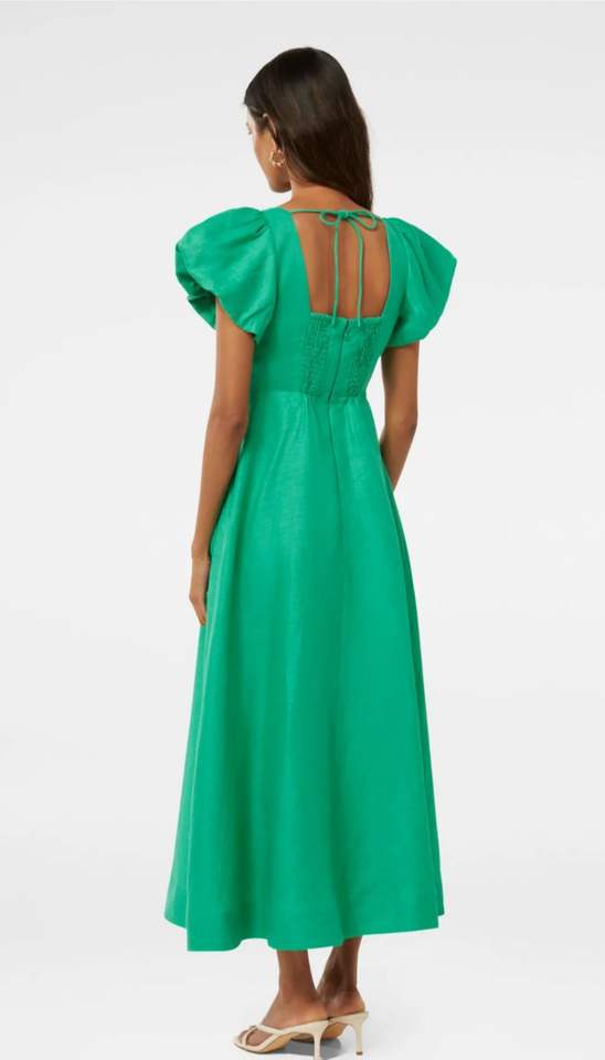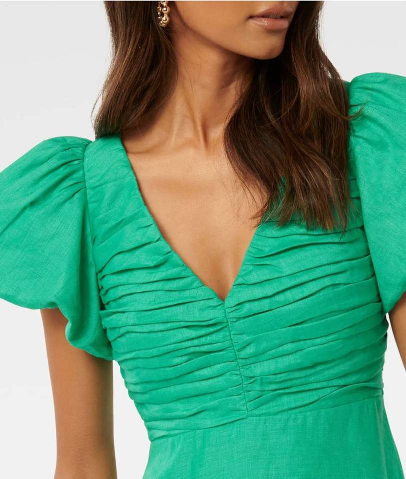 New Green Pure Linen June Petite Ruched Midi Dress Korean Long Beach Short Sleeve Solid Plain Dress for Women