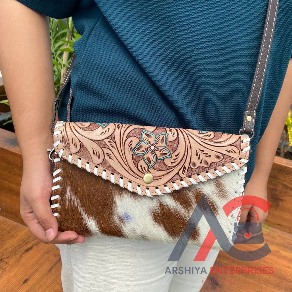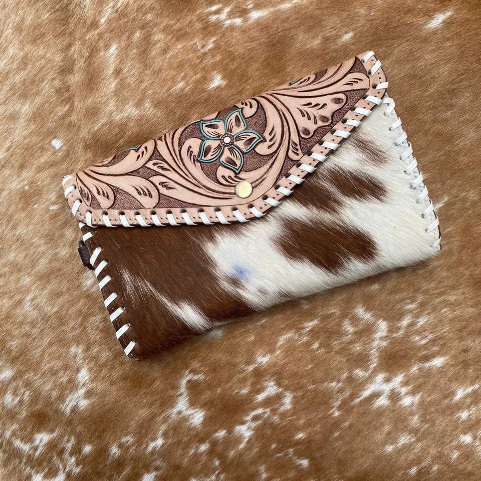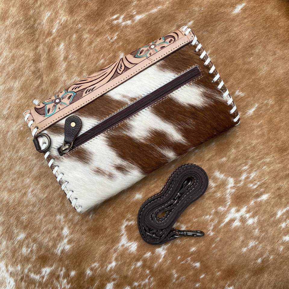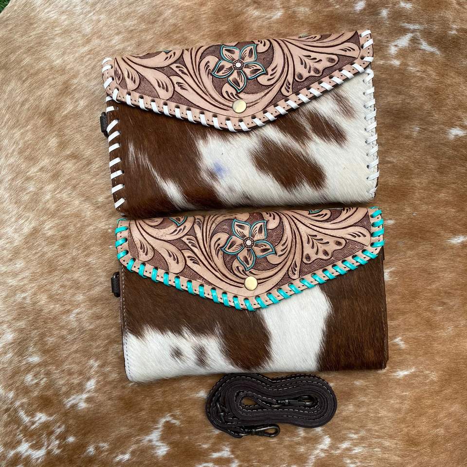 New Hair on Hand Tooled Leather Crossbody Wallet Purse for Women Western Genuine Leather Floral Travel Phone Clutch with Strap