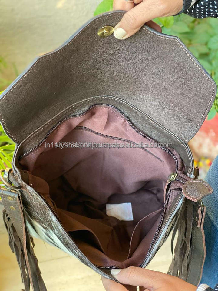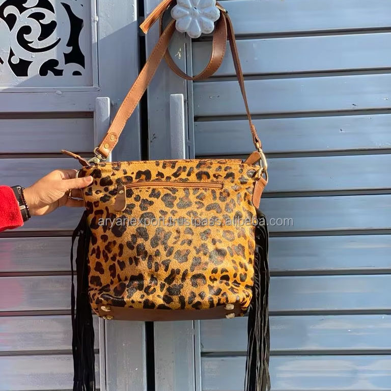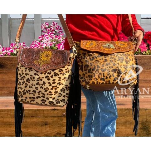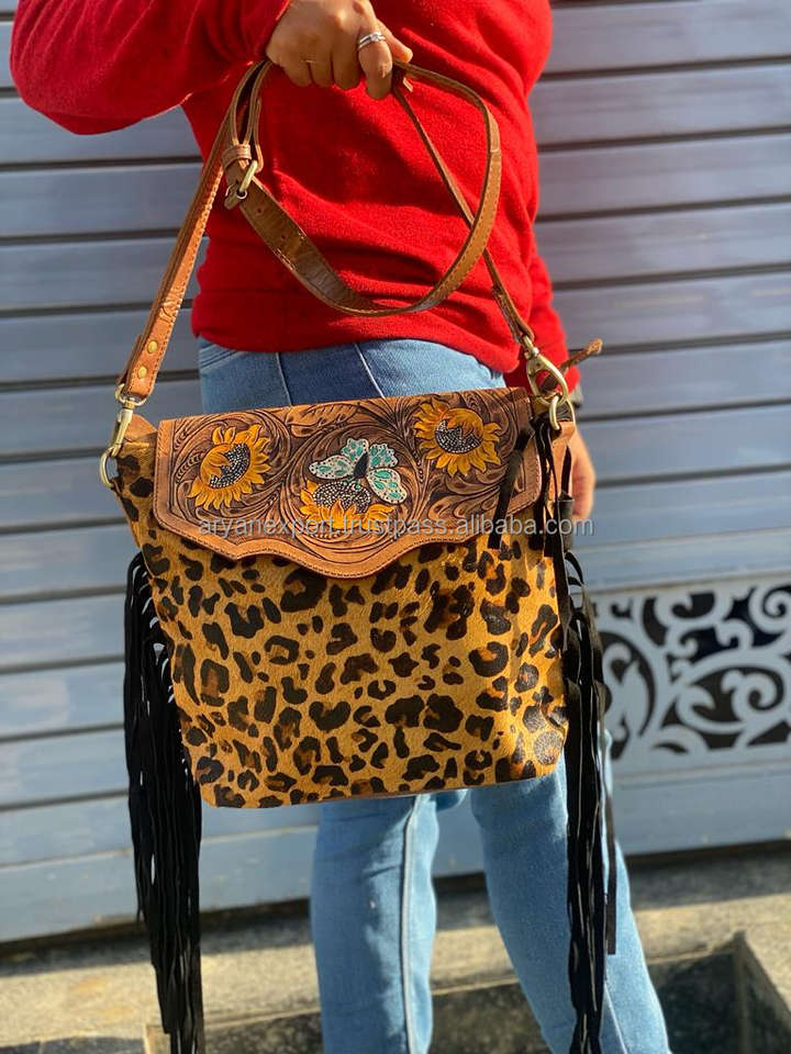 New Hair on Leopard Print Hand Tooled Leather Fringe Crossbody Bag for Women's High Quality Trendy Genuine Leather Shoulder Bags