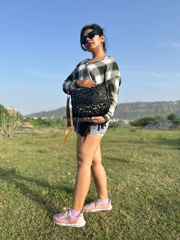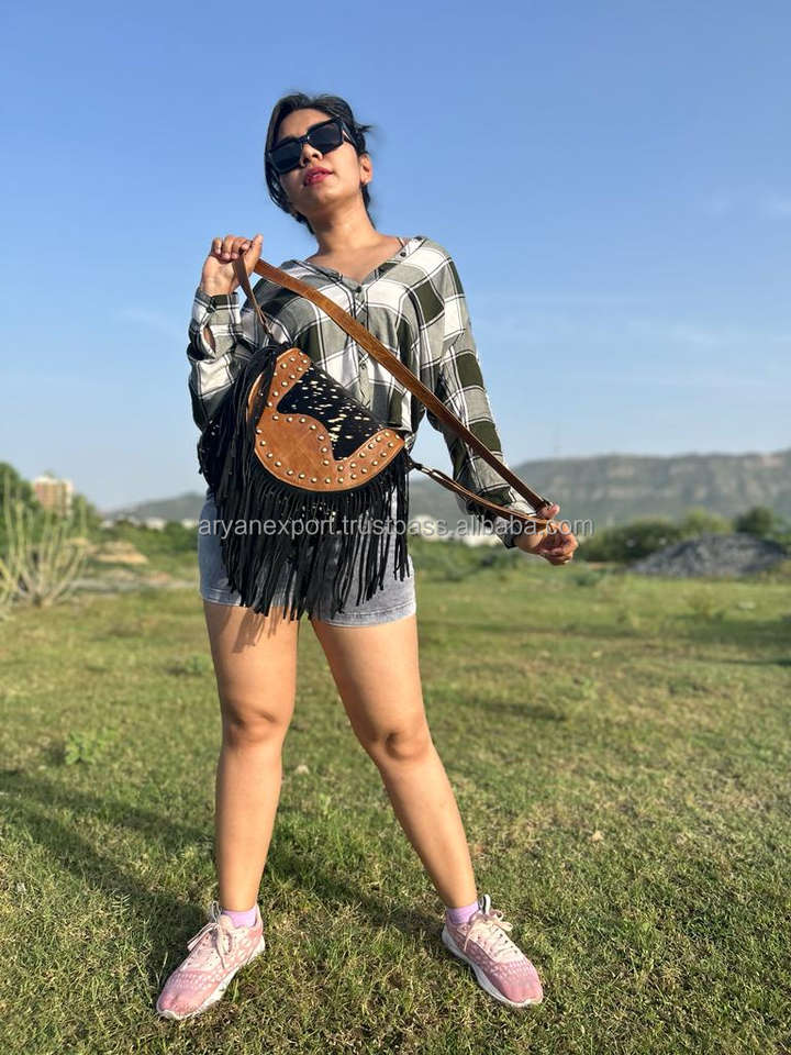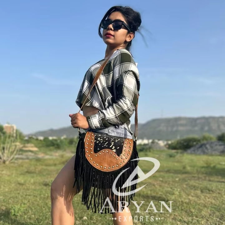 New Hair on Metallic Suede Leather Fringe Cowhide Crescent Purse Women's for Fashionable Hot Selling Barrel Shaped Crossbody Bag