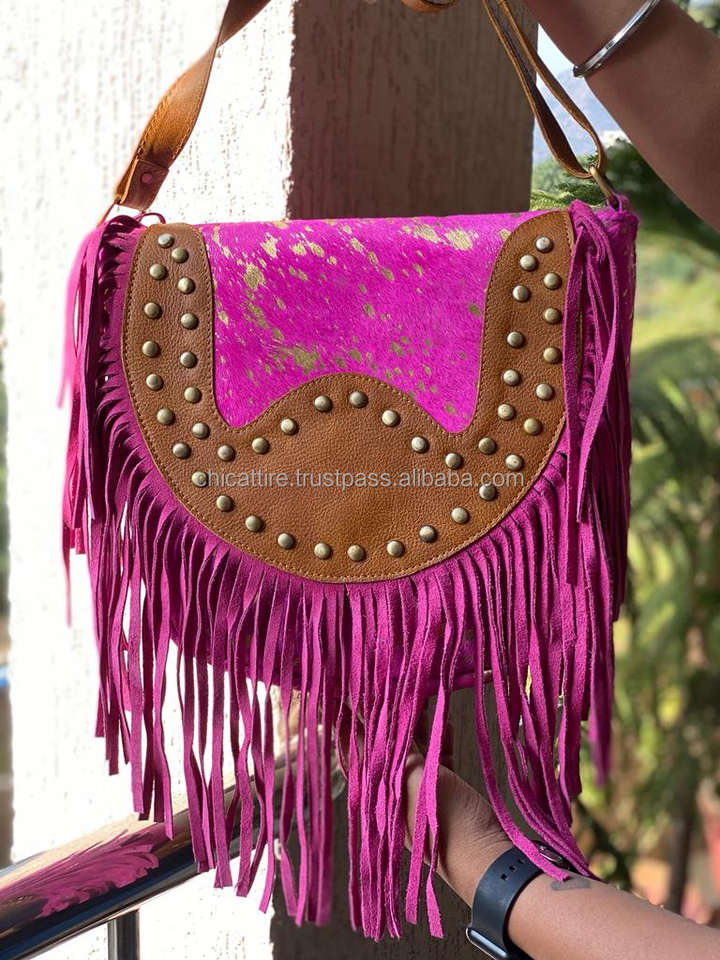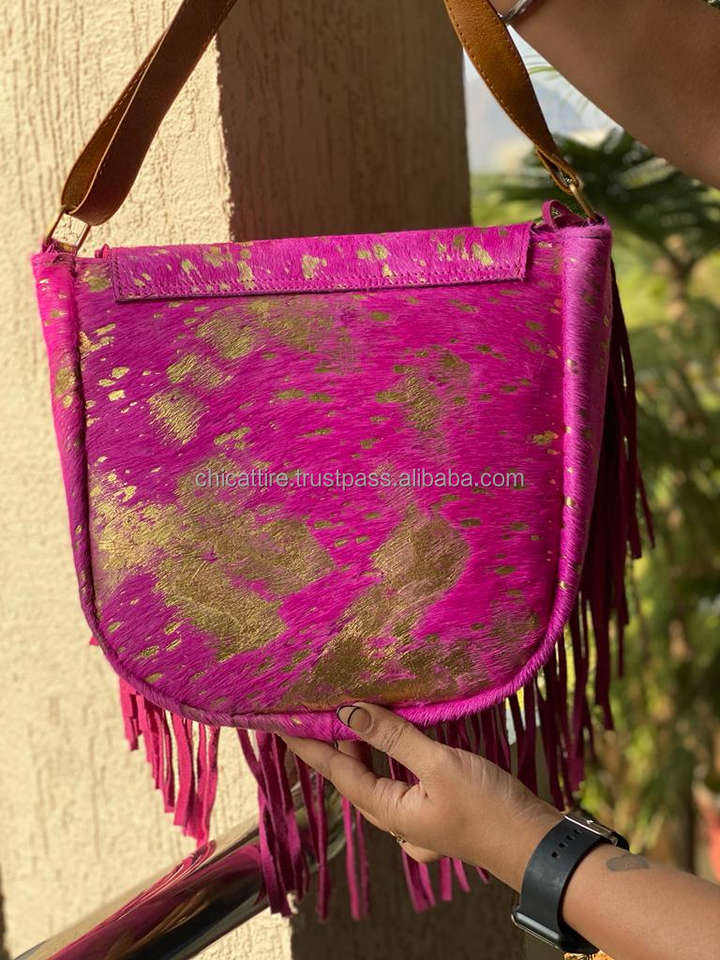 New Hair on Pink Metallic Suede Leather Fringe Cowhide Crescent Purses Women Fashionable Hot Selling Barrel Shaped Crossbody Bag