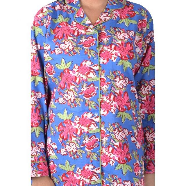 New Hand Block Floral Print Pure Cotton Pajama Set Soft and Comfortable Nightwear Dress for Spring and Summer