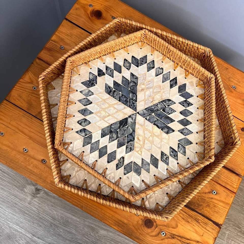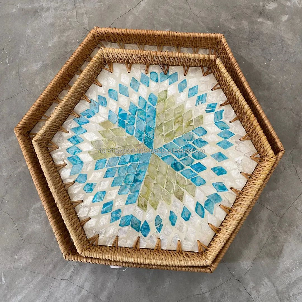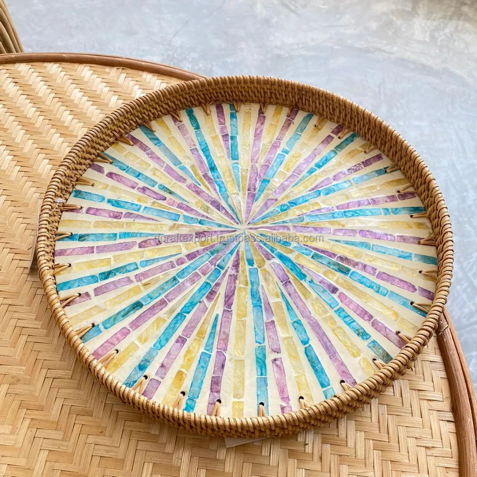 New Hand Made High Quality Rattan Tray with Mother of Pearl Inlay Handle Hand Made Tray for Hotels for Christmas by RF Crafts