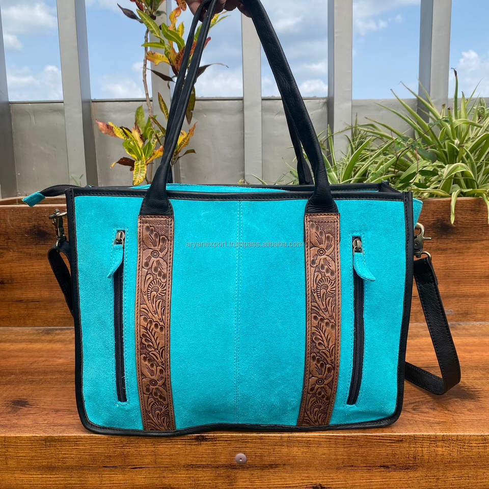 New Hand Tooled Boot Stitch Turquoise Suede Leather Crossbody Tote Bag Premium Genuine Leather Concealed Carry Purse for Women's