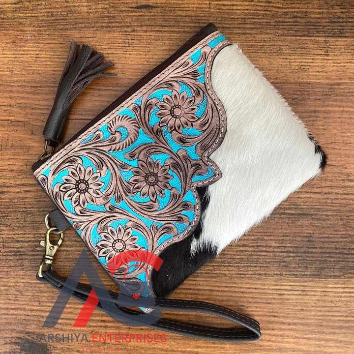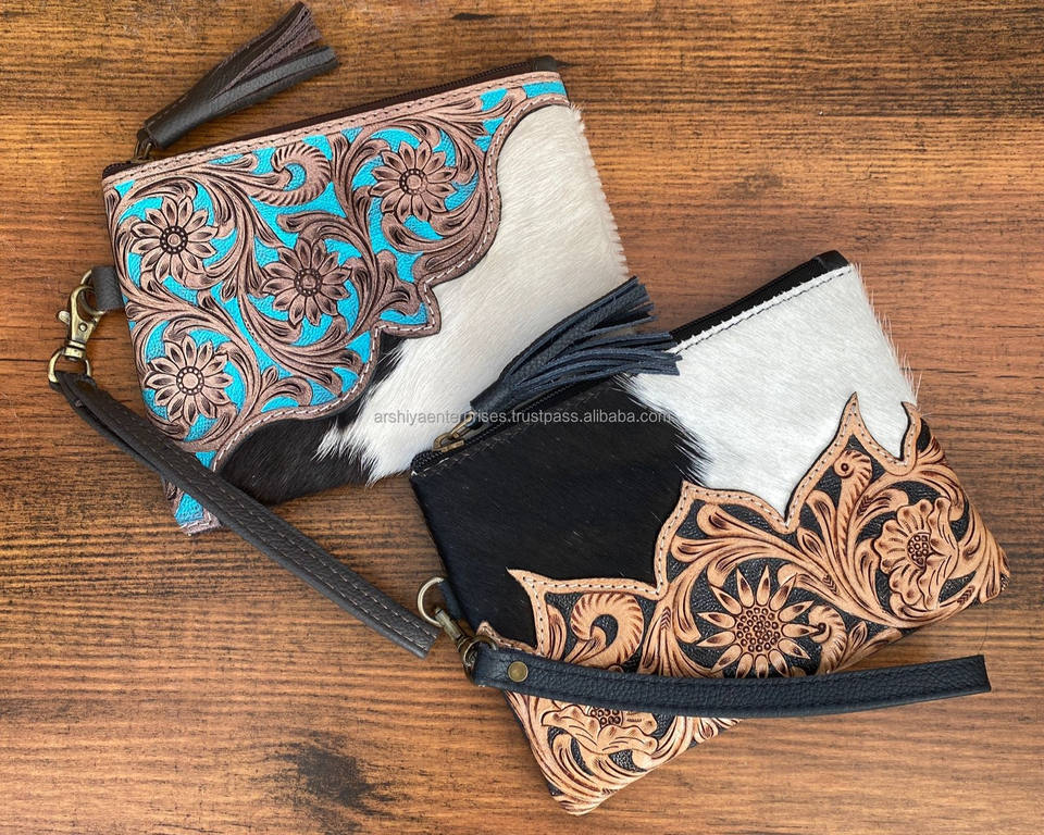 New Hand Tooled Cowhide Leather Zipper Travel Makeup Pouch for Women's High Quality Genuine Leather Wristlet Tassel Clutch Purse