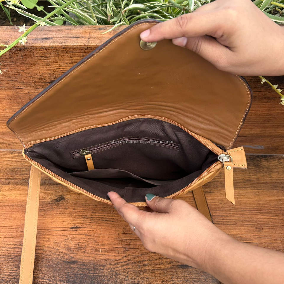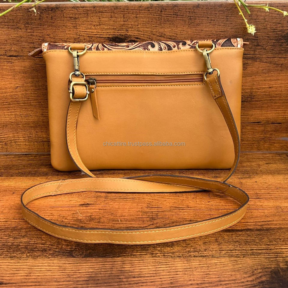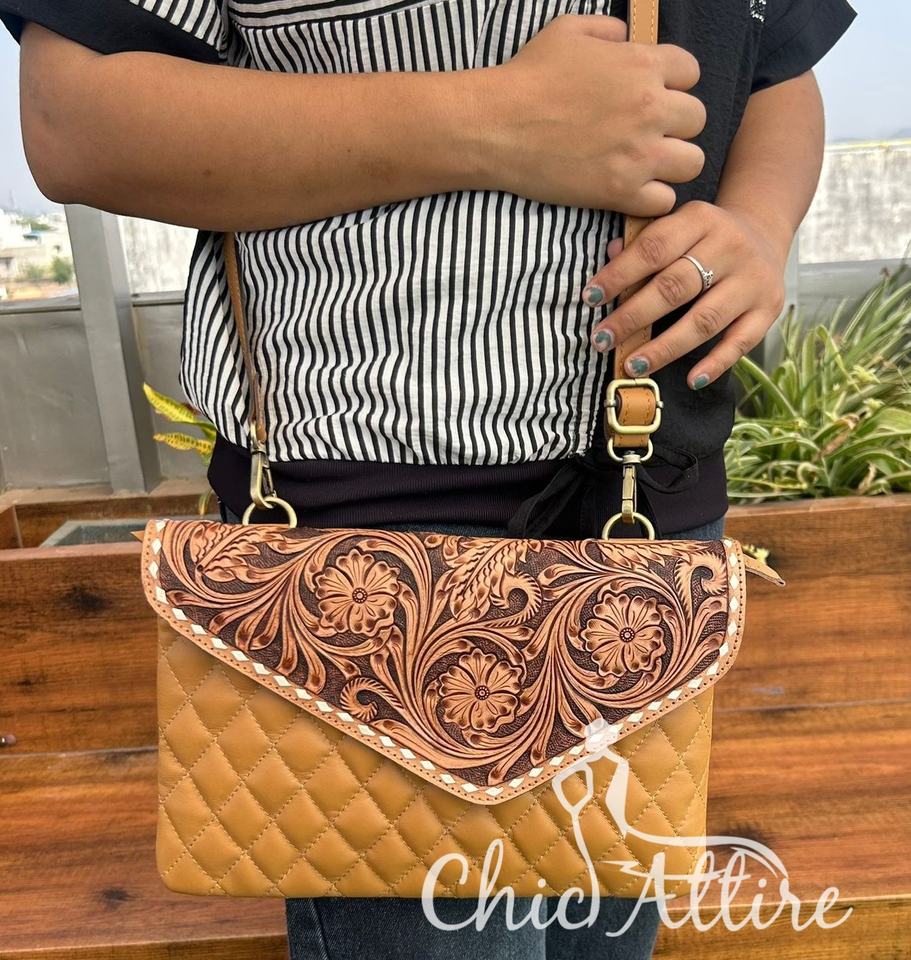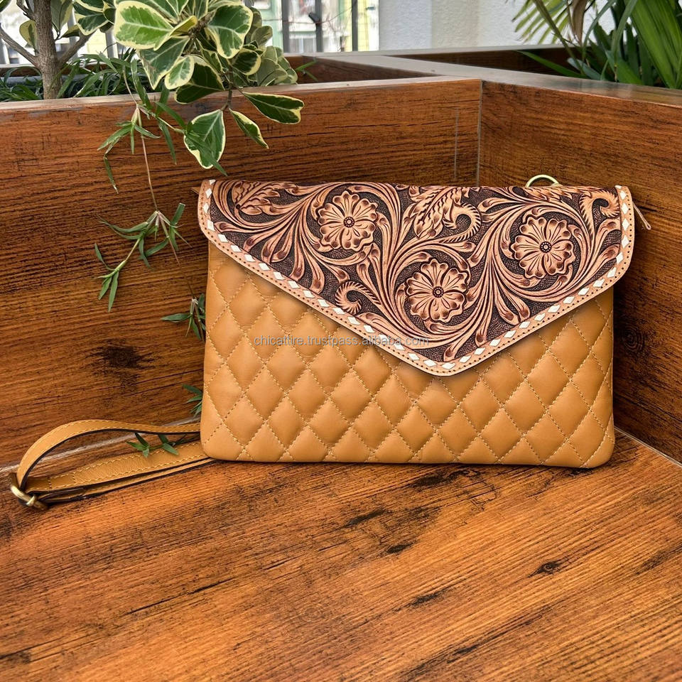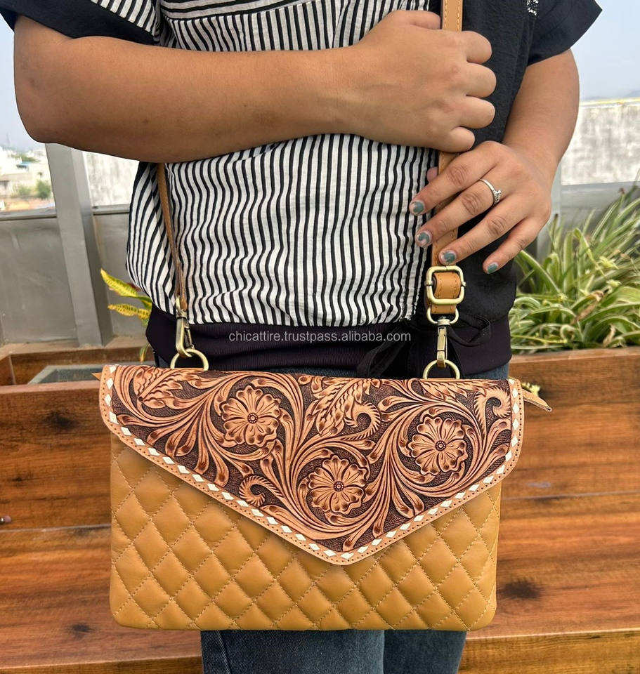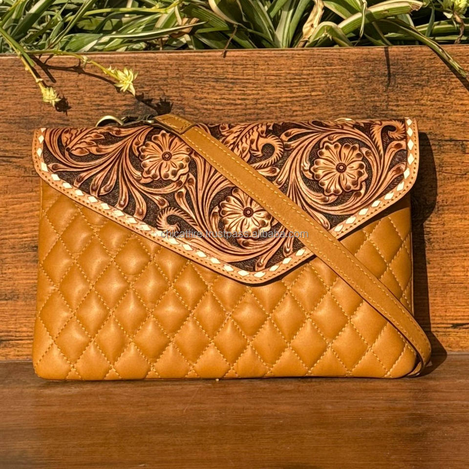 New Hand Tooled Diamond Lattice Envelope Crossbody Bags for Women Wholesale Quilted Leather Clutch Handbags Cowhide Floral Purse