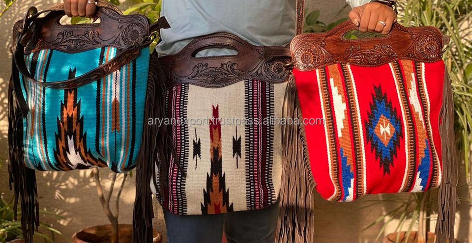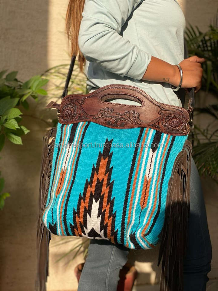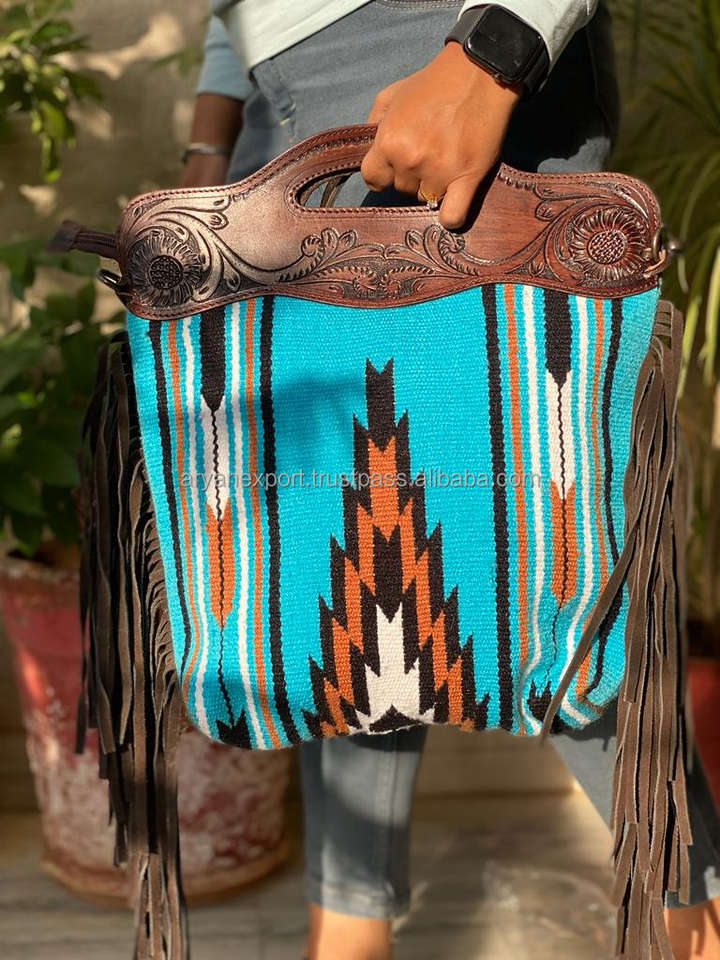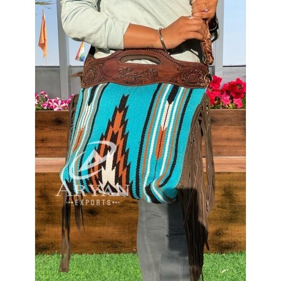 New Premium Handcrafted Tooled Jacquard Fabric Fringe Leather Shoulder Purse High Quality Genuine Leather Cowgirl Handle Handbag