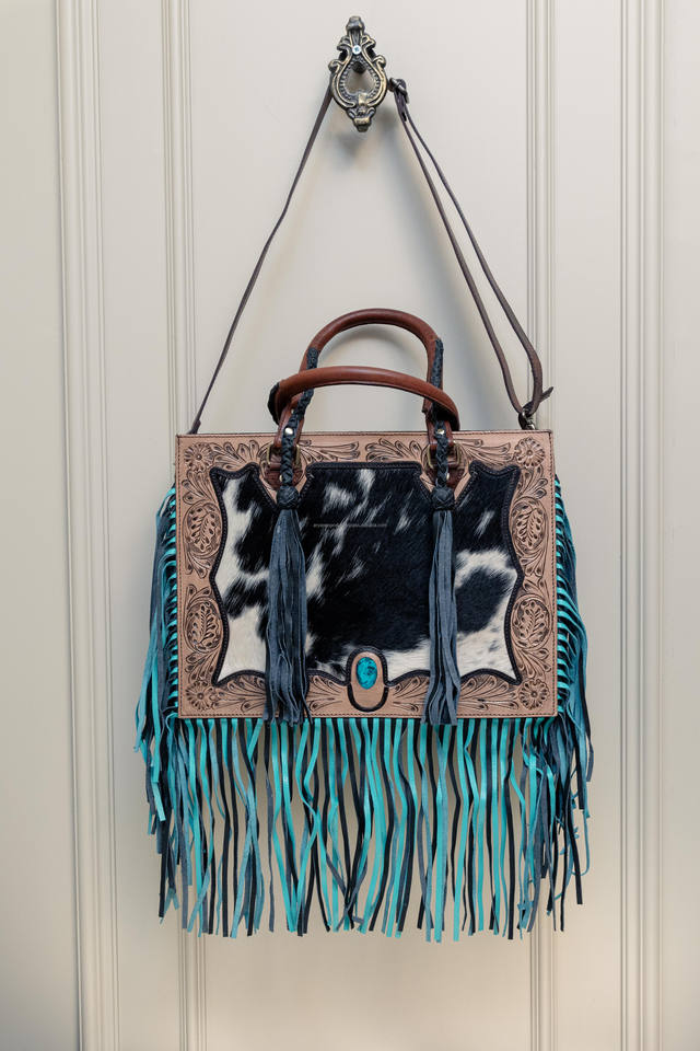 Product Name:Western Hair On Hide Tooled Leather Fringe Tote Bag