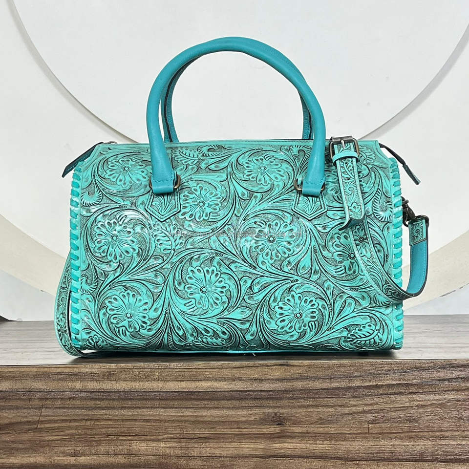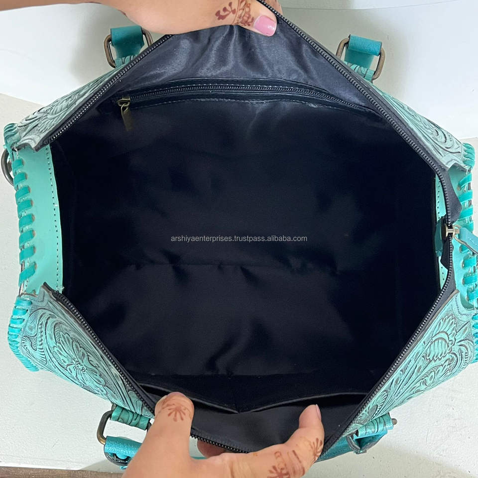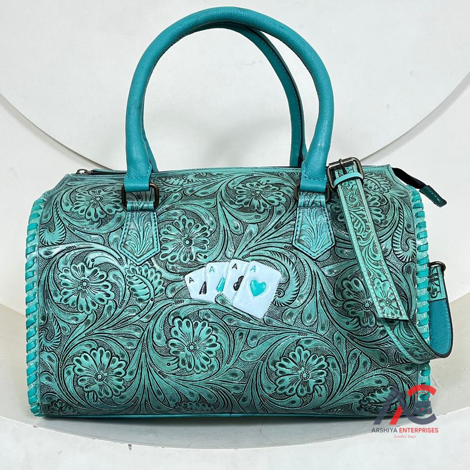 New Hand Tooled Leather Adjustable Speedy Duffel Bag Outdoor Activity Zipper Closure Card Design Genuine Cow Leather Duffle Bags