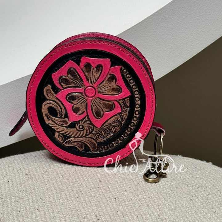 New Hand Tooled Leather Bohemian Women Mini Coin Purse Key Ring Western Floral Round Coin Pouch Custom Leather Carved Coin Cases