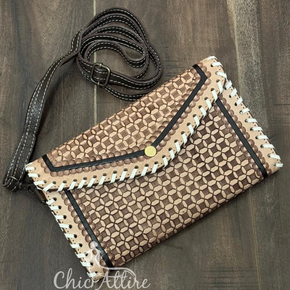 New Hand Tooled Leather Envelope Clutch with Shoulder Strap Custom High Quality Purse Designer Handmade Evening Bag for Women's