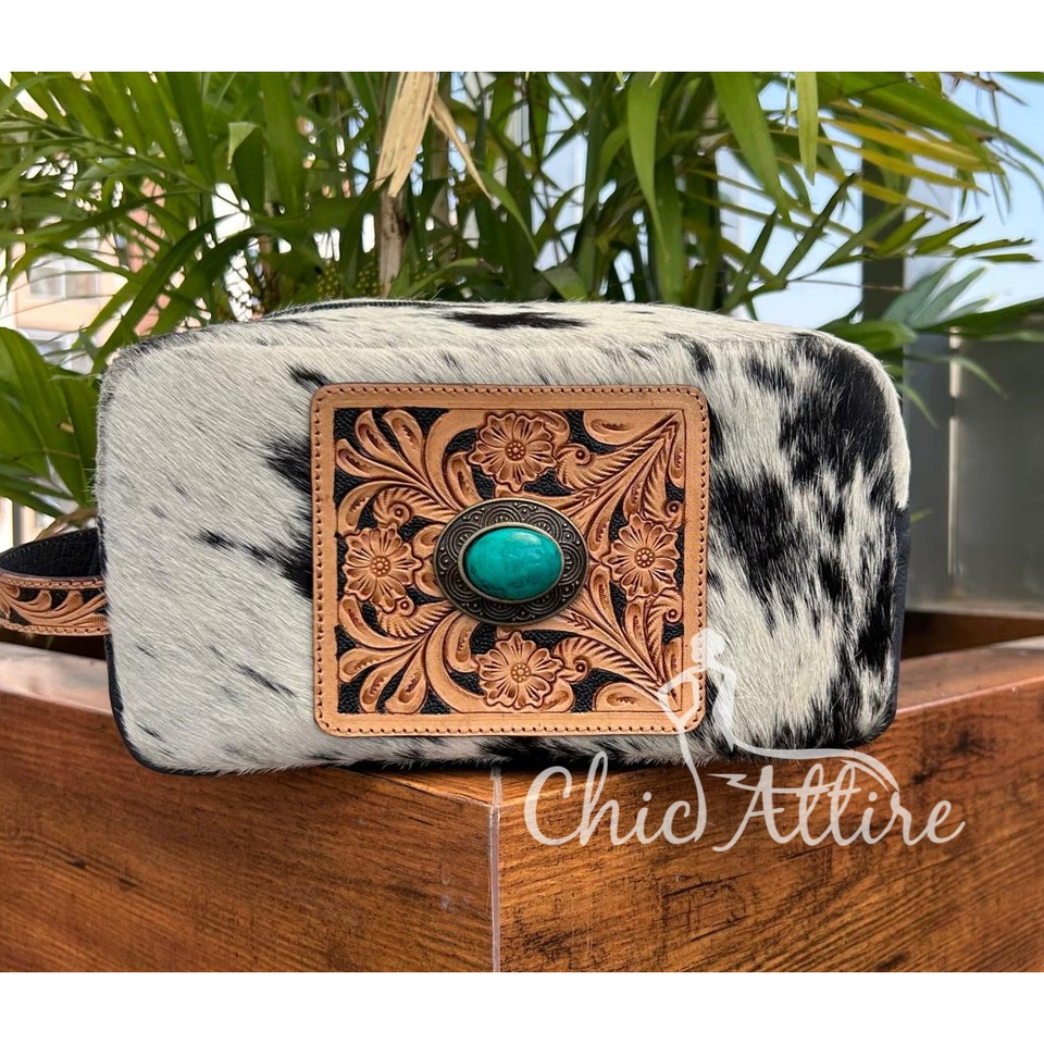 New Hand Tooled Leather Travel Toiletry Bag Large Capacity Turquoise Stone Cosmetic Bags Cowhide Portable Storage Makeup Bags